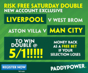 This time it is just a double and if you join Paddy Power today you can get 5/1 instead of 6/4 on Manchester City to beat Aston Villa and Liverpool to Beat West Brom AND If it loses, get your money back as a free bet!